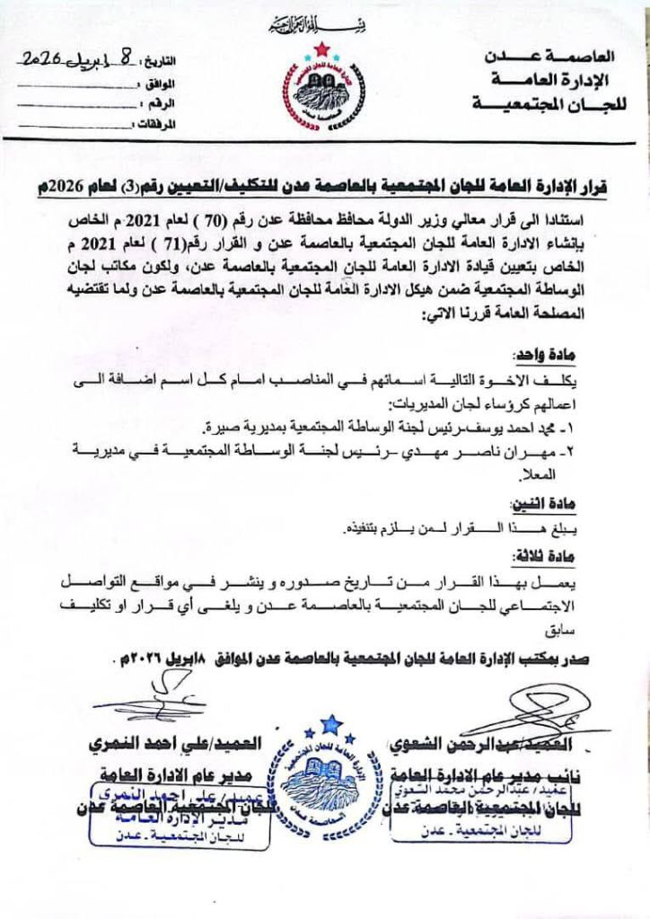 أصدرت قيادة اللجان المجتمعية في العاصمة عدن، اليوم، قراراً إدارياً جديداً رقم (3) لعام 2026م، قضى بتكليف رئيسين للجنة الوساطة المجتمعية في مديريتي صيرة والمعلا، وذلك في إطار تعزيز دور اللجان في معالجة القضايا المجتمعية وترسيخ الاستقرار المحلي.