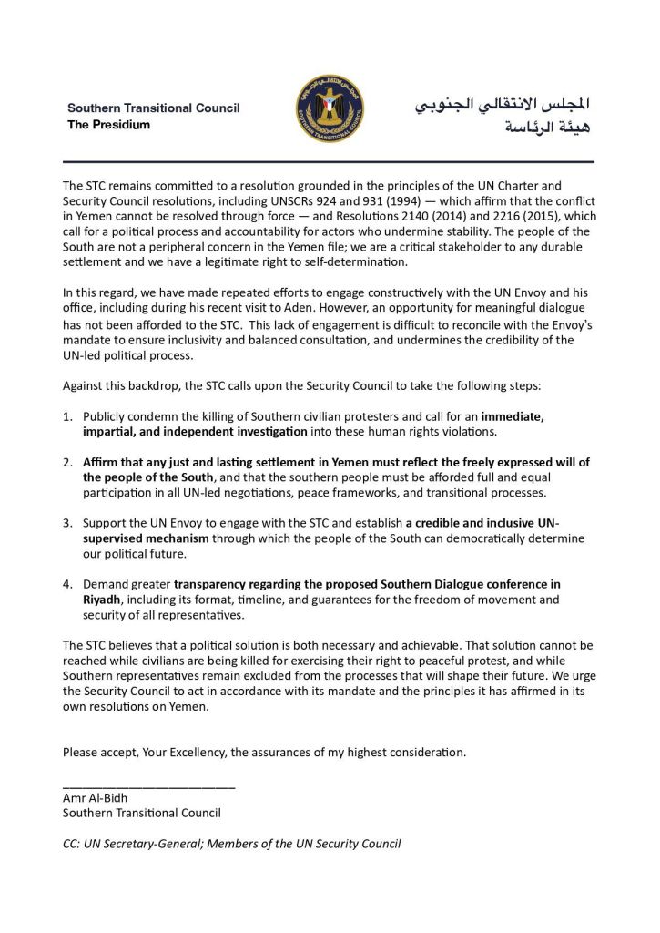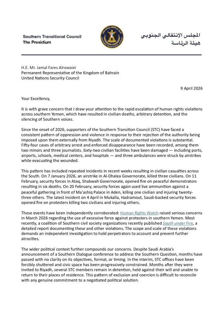 أطلع المجلس الانتقالي الجنوبي، مجلس الأمن الدولي، على آخر المستجدات في الساحة، مؤكدًا ضرورة اتخاذ إجراءات فعّالة لحماية المدنيين، بما يضمن صون حقوق أبناء الجنوب وتمكينهم من تقرير مستقبلهم بإرادتهم الحرة.